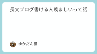 日常生活 長文ブログ書ける人羨ましいって話 何をどうしてそんなに長く書けるんだって思ってます。特に自分の言葉で長文書ける人羨ましいです。この記事もXの呟き1つよりも短くなりそうってか既に短い。Xといえば、あれ、短文の投稿1つ1つにアドレスがついてるの毎回すごいなってたまに思う。この記... 2025.09.26 日常生活